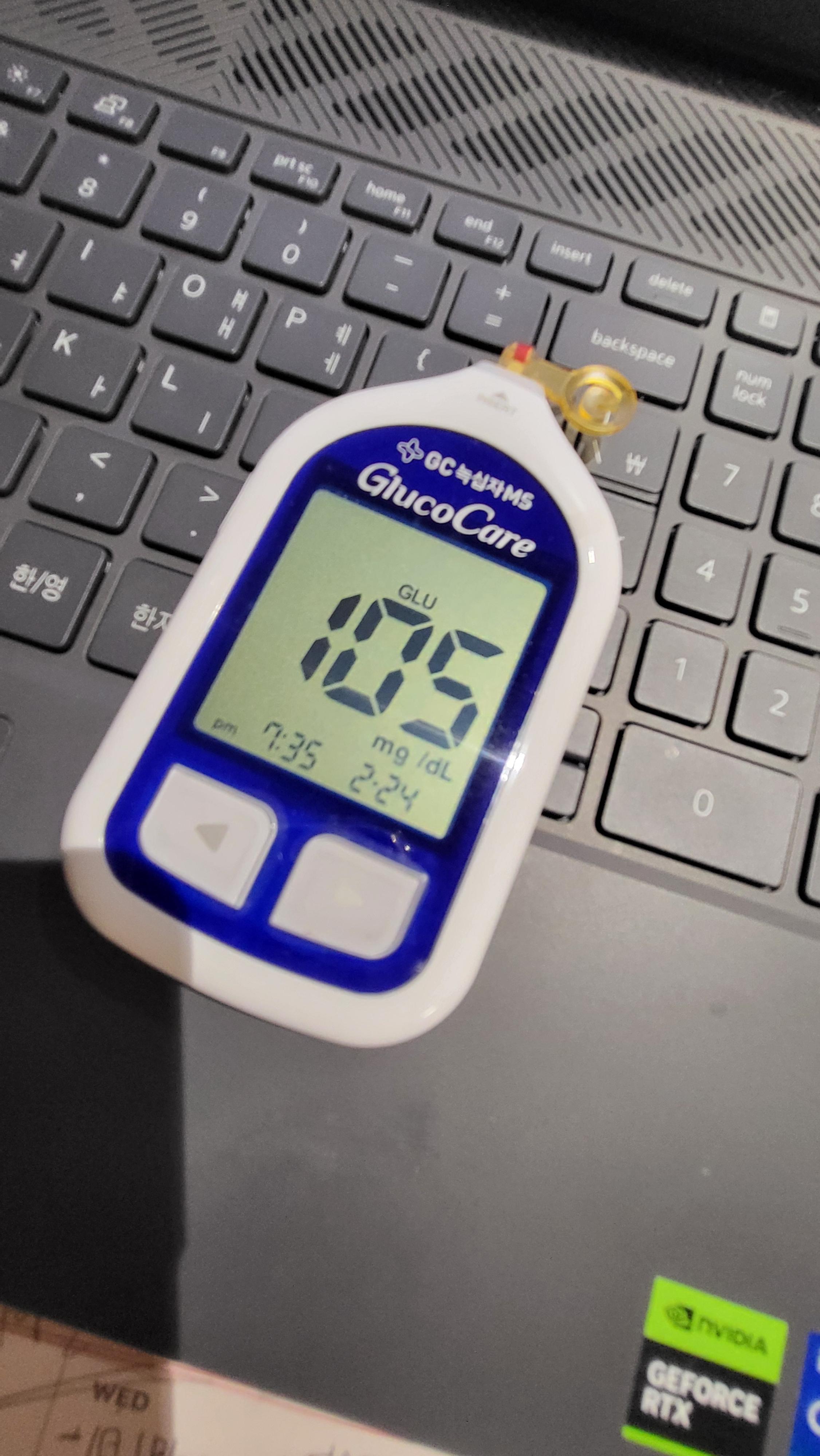⊙오늘 측정: 식후 약 45분에 재보니 105 mg/dL. 바로 슬로러닝 20분 실행(처음이라 강도는 아주 낮음). 운동 직후 재측정 결과 92 mg/dL.